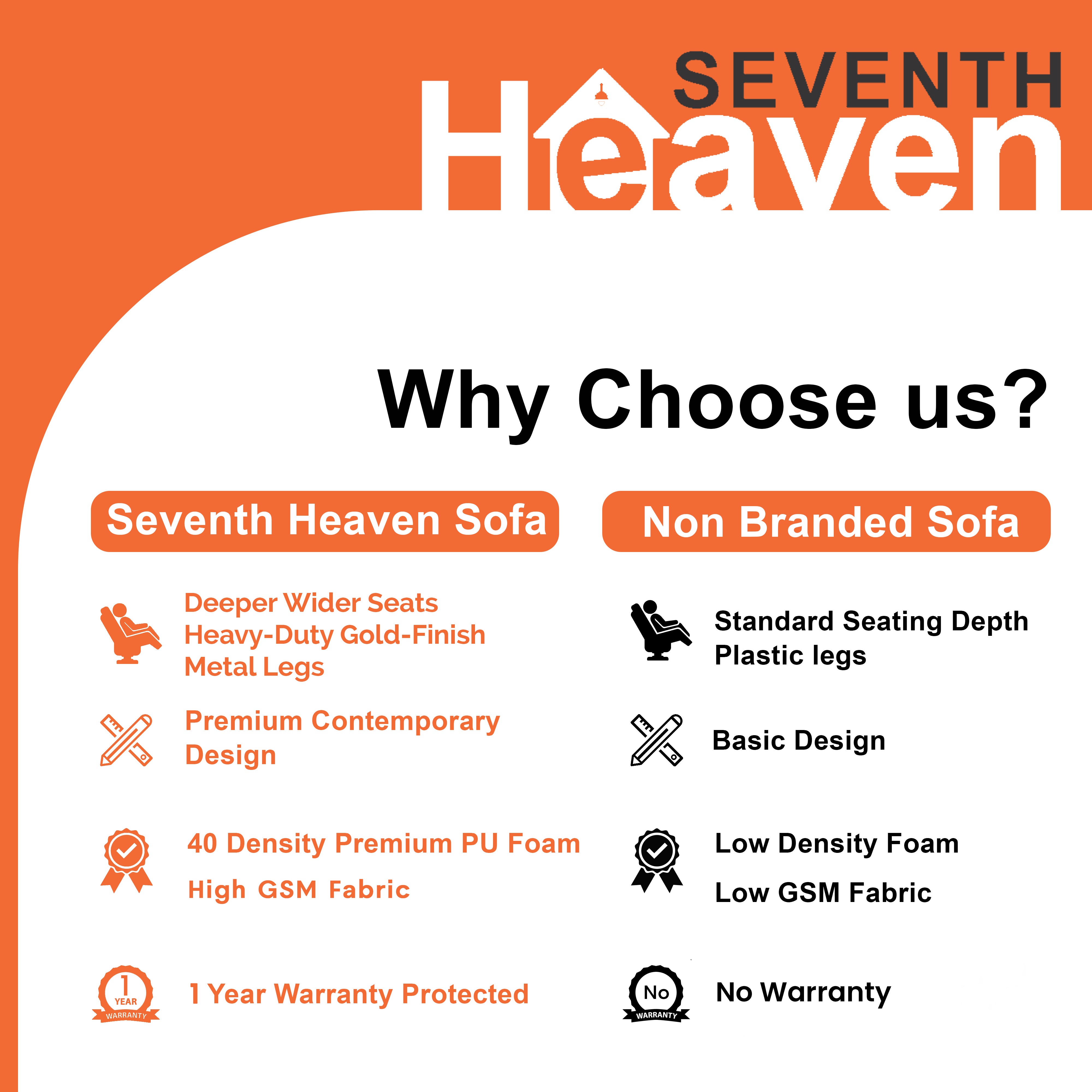 Decorate your living room with the Seventh Heaven Rome sofa, a work of art of luxury, comfort, and stylish design that redefines your space with sophistication. Created for maximum relaxation, this Seventh Heaven sofa has a high backrest with adjustable headrest support, providing optimum seating posture and all-day comfort. Upholstered in superior fabric with high-density PU-foam cushioning, it offers the best softness and support. With a sturdy wood frame and standing on royal Sheesham wooden legs, the Rome Sofa by Seventh Heaven promises stability, longevity, and classic elegance, and is the perfect addition to your home or office.